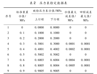 現場用SR密度繼電器對一只型號為 Const 211的0. 1級壓力表按照檢定規程進行校準,數 據如表1所示。在實驗室用0.02級的一等標準 活塞式壓力計對該壓力表按照壓力表檢定規程進 行檢定,檢定結果如表2所示。